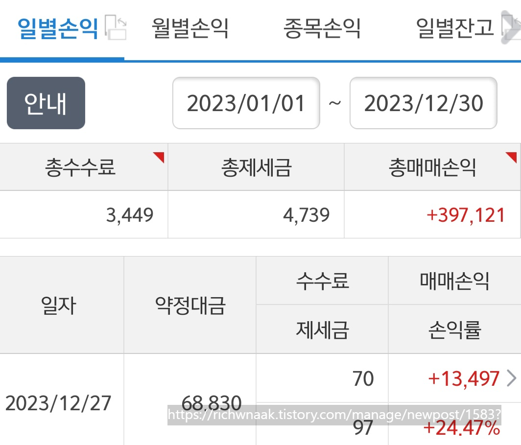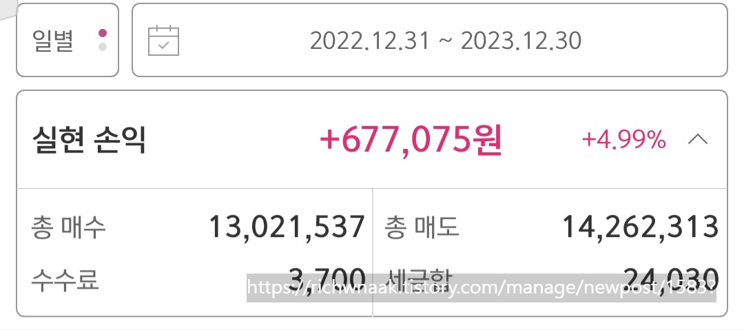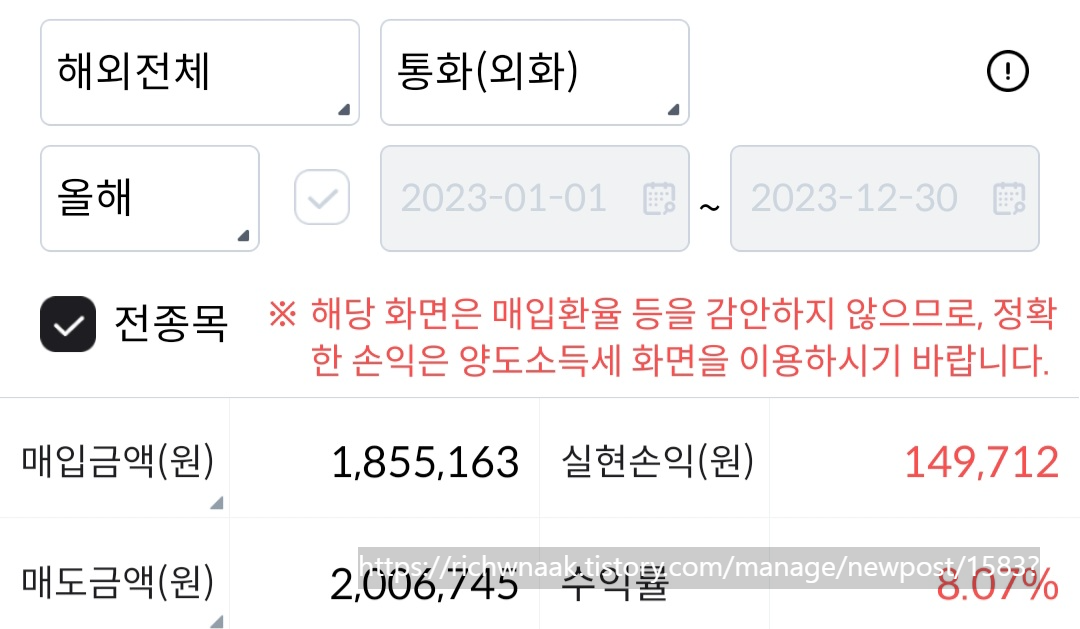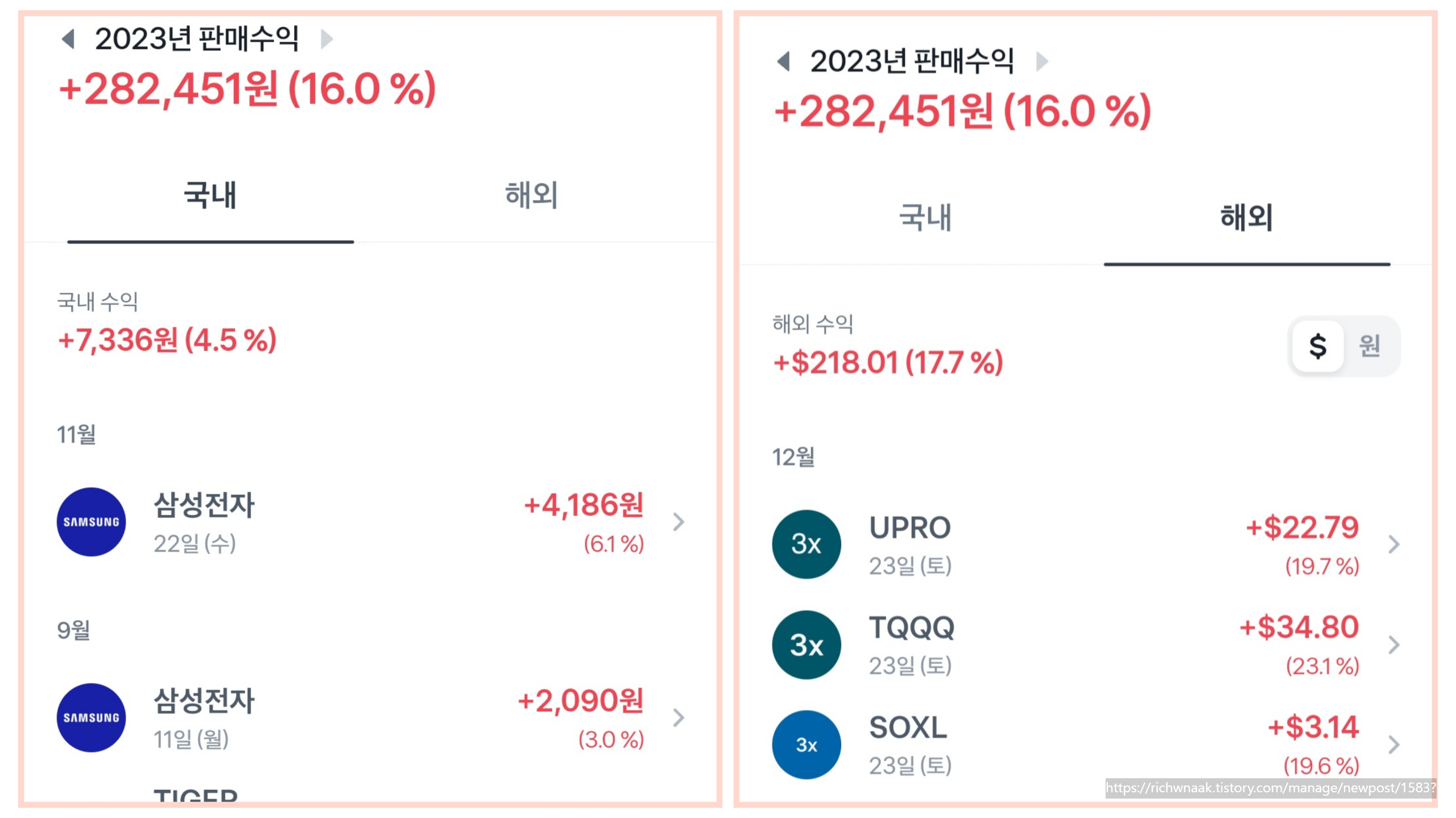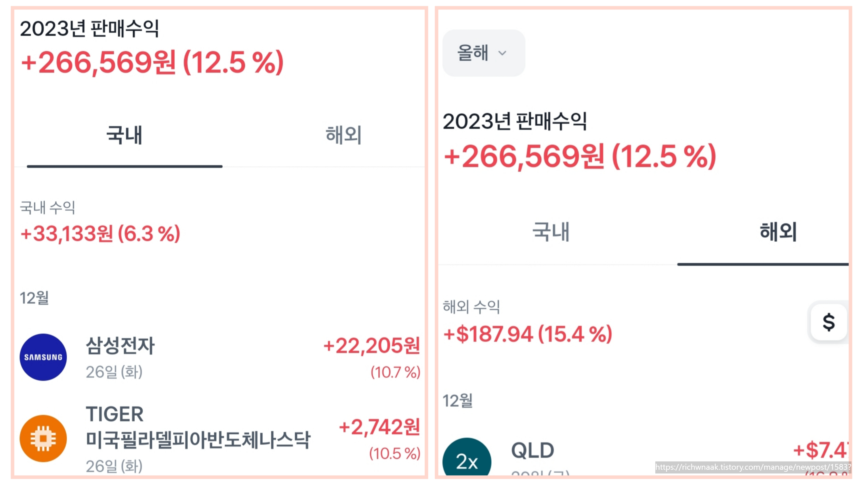 2023년 개미투자자 국내주식수익, 해외주식 수익을 개인기록 인증샷으로 남겨봅니다.