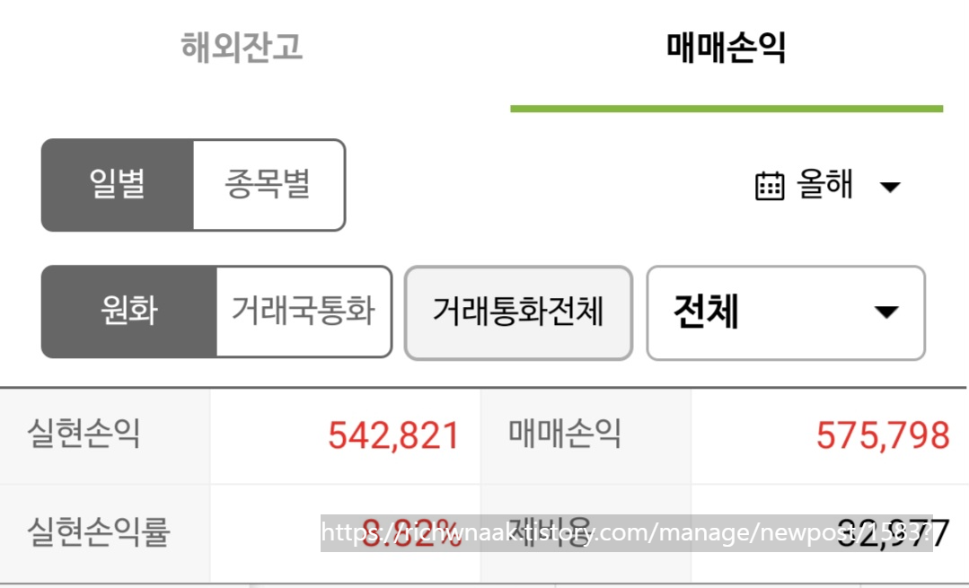 나무증권 해외주식 수익금은 542,821원입니다. 올해 수익이 20% 이상 난 주식을 매도를 했어야 했는데. 하지 못해서 아쉬움이 남습니다.