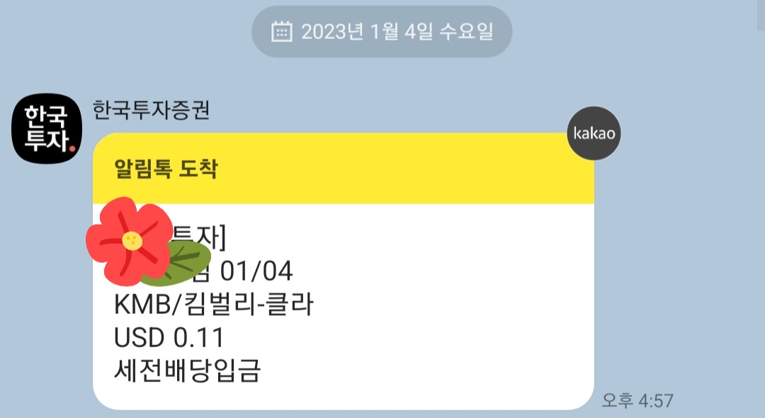 1월 KMB 킴벌리-클라 배당금으로 0.11달러를 배당받았습니다.