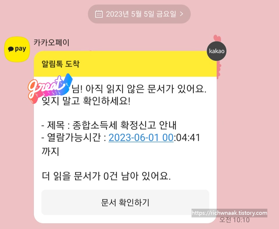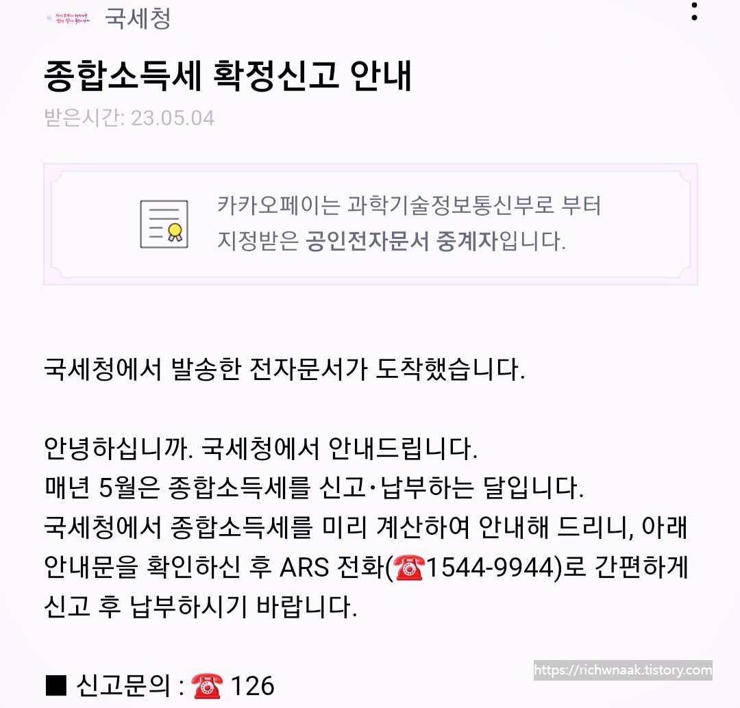 카카오페이로 종합소득세 확정신고 안내가 왔습니다. 문서가 이렇게 카카오페이 알림톡으로 온 것이 신기합니다.