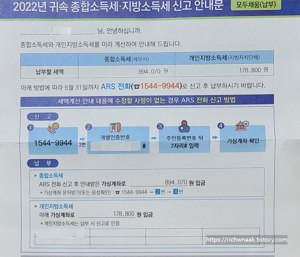 안내문을 확인한 후 ARS 전화(1544-9944)로 간편하게 신고 후 납부할 수 있습니다.