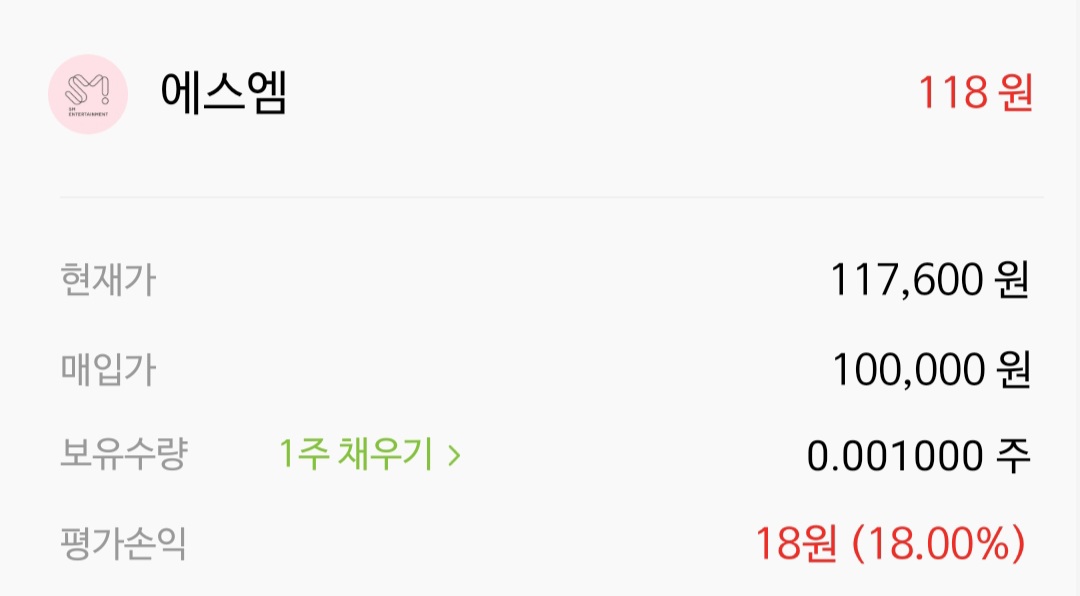 에스엠 주식을 100원 어치 샀습니다. 재미삼아 넣는 것입니다. 100원이 118원이 되어서 매도를 합니다.