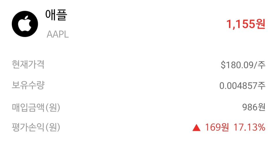 나무증권에서 애플을 1,000원치 샀습니다.