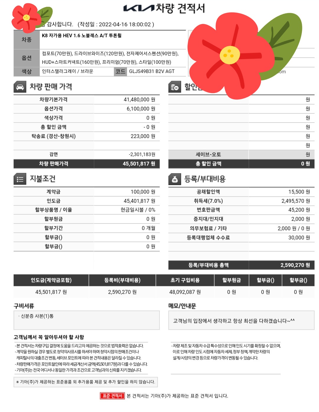 K8하이브리드 노블레스 가격은 41,480,000원, 옵션 가격 6,100,000원, 탁송료 223,000원에 감면 -2,301,183원으로 차량 가격만 45,501,817원이네요.