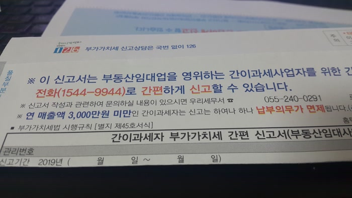 부동산임대업을 영위하는 간이과세자 부가가치세 간편 신고서를 우편 회신 또는 전화(1544-9944)로 간편하게 신고를 할 수 있다고 해요.