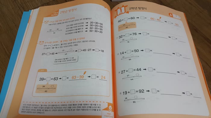 기계식으로 계산을 하는 것이 아니라 '이렇게 계산해요!'로 원리를 이해할 수 있도록 하고 있어요. 수학에서는 개념과 원리가 매우 중요하니깐요. 때로는 학원에서 원리보다는 기계적으로 계산을 하는 것을 종종 보게 되네요. 개념과 원리를 이해하면 응용문제까지 적용하기 쉽게 된단다.