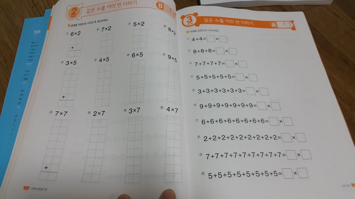 같은 수를 여러 번 더하기를 해요. 같은 수를 여러 번 더하는 것이 곱하기라는 것을 알려주네요. 무작정 구구단을 외우기 전에 좋은 단계이네요.