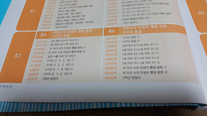 초등학교 2학년 기적의 계산법은 3권은 자연수의 덧셈과 뺄셈 중급, 구구단 초급이고, 4권은 자연수의 덧셈과 뺄셈 고급, 구구단 중급이네요.