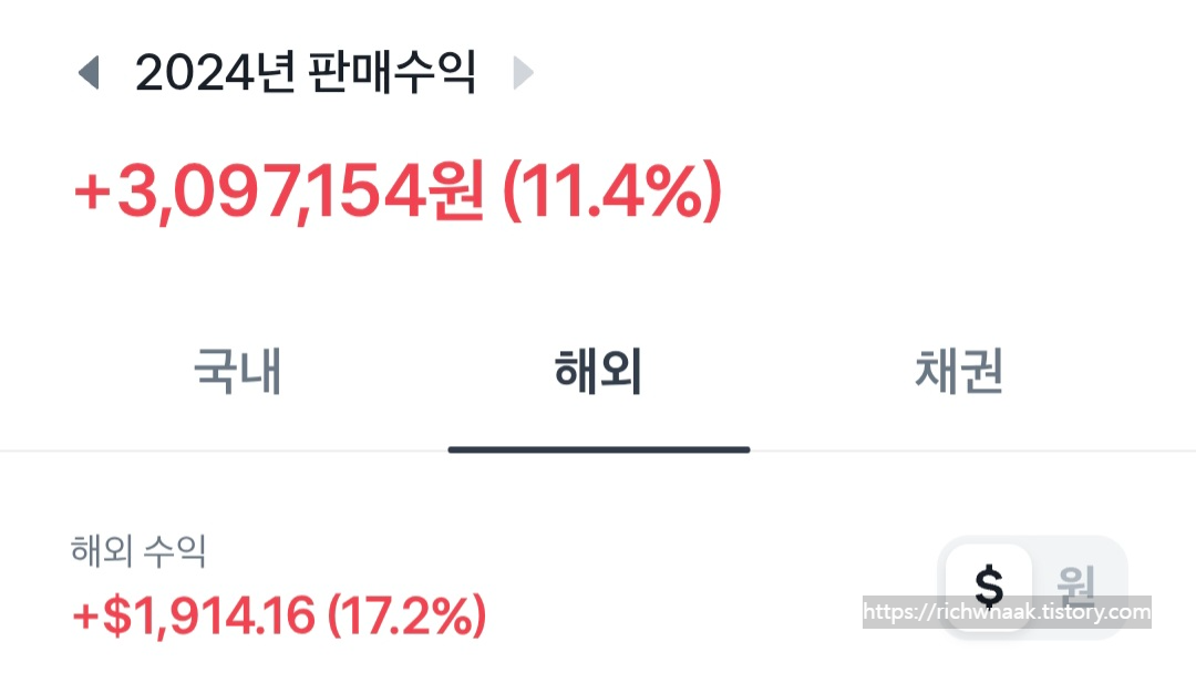 2024년 국내주식, 해외주식 총 수익은 21,139,848원입니다. 여태까지 주식을 보유한 중에 2024년이 최고입니다.