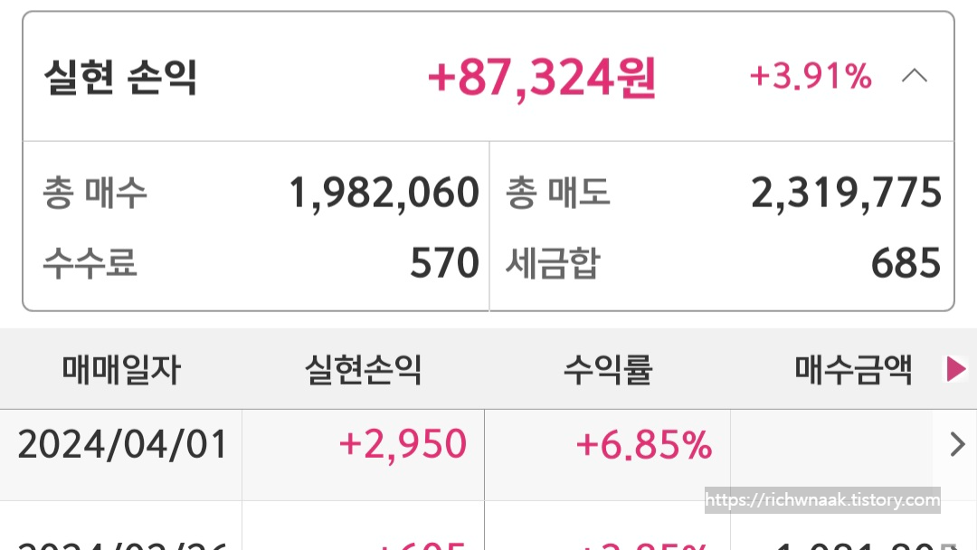 아들 주식계좌 수익으로 87,324원의 수익이 났습니다. 미성년자 아들에게는 300만 원 증여를 해놓았습니다. 올해 좀 더 증여를 할 수 있도록 하겠습니다.